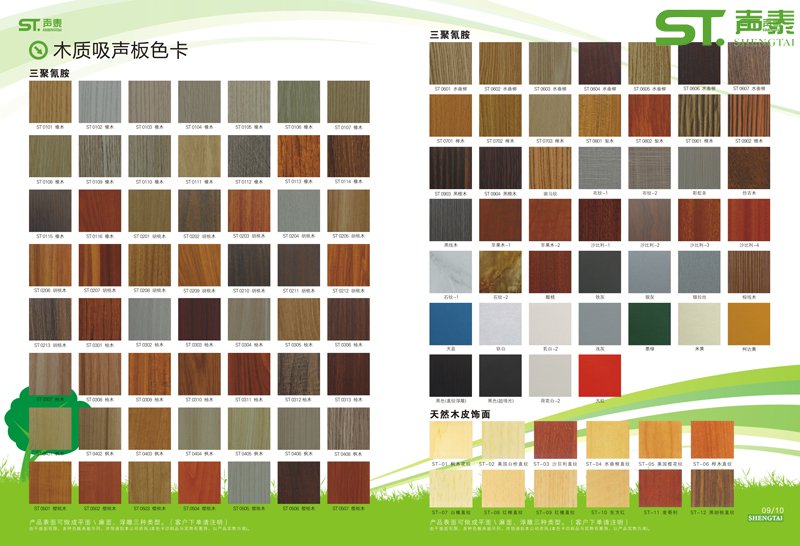 木質(zhì)槽孔吸音板指的是槽木吸音板與孔木吸音板。兩種吸音板顏色,飾面,基材,型號都可根據(jù)客戶要求定做。木質(zhì)槽孔吸音板常規(guī)做的顏色有紅櫻桃,楓木,櫸木,沙比利等。很多客戶會問到除了這幾種顏色還可以做哪些顏色呢?現(xiàn)在由小編上傳木質(zhì)穿孔吸音板的色卡,供客戶選擇。