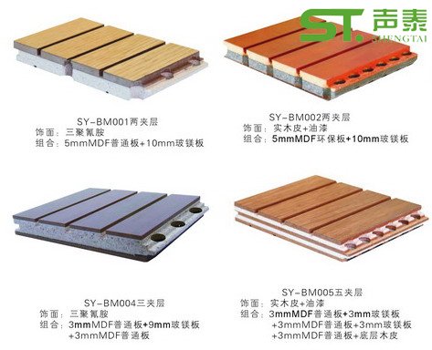 多層復合吸音板是根據聲學原理采用防火B1、A2級基材精致加工而成,既有木裝飾本身的裝潢效果,又有良好的吸聲性能。與其它吸聲產品相比有獨到之處,是當今國內外首選使用的中、高檔室內裝飾材料。材質及顏色根據客戶需要,有櫻桃木、沙比利、楓木、黑(紅)胡桃、紅白影、紅白櫸、麥哥利、泰柚等等,品種有開槽多孔型、D小眼孔型,組合型等多種樣式可供選擇。現在就讓我們進一步的來了解什么是多層吸音板?多層復合吸音板又具有哪些特點?