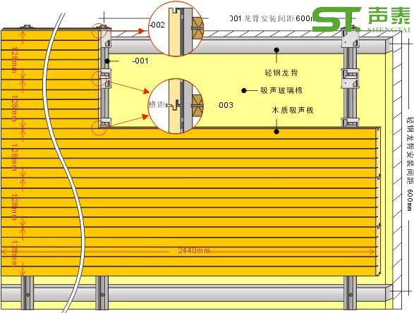 吸音板豎直安裝,凹口在右側,則從左開始用同樣的方法安裝。二塊吸音板端要留出不小于3mm的縫隙.