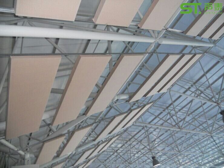 空間吸聲體大多懸掛于建筑物空間的頂部,且以離頂吊掛居多。板狀空間吸聲體可以水平分散吊掛,也可垂直分散吊掛,還可水平、垂直復合吊掛,在總面積相同情況下,降噪效果基本相同。水平懸掛板狀空間吸聲體的離頂高度一般為房間凈高的1/5至1/7左右,一般來說,考慮到施工的難易程度,空間吸聲體懸掛在建筑頂部的鋼架以下,其高度剛好會在房間凈高的1/5至1/7左右,達到吸聲及裝飾的要求;若條件允許,可掛得更低些,離聲源近些。為了提高懸掛空間吸聲體的建筑裝修效果,應對空間吸聲體的形式、色彩、懸掛方式等進行綜合考慮。若使空間吸聲體懸掛成一定的藝術圖案,并與采光、照明、通風和建筑裝修等互相配合,則整體效果更好。