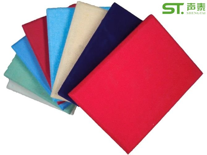 2.布藝吸音板—核心材料是防火A級離心玻璃棉。離心玻璃棉作為一種在世界各地長期廣泛應用的聲學材料,遠銷東南亞、歐洲等地被證明具有優異的吸聲性能。