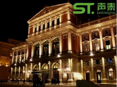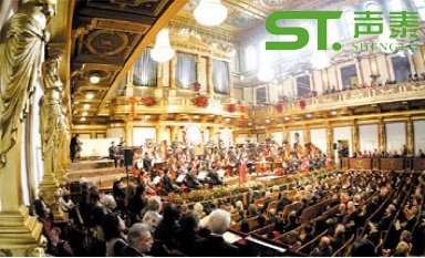 維也納宴會大廳寬20米、高17.5米、長35米。資料記載大廳容積15000立方米,座位1680座,站位500,每席容積8.9立方米。滿場中頻(500Hz)混響時間2.1秒。金色大廳建成后,其優良的音質一直受到人們的高度評價。難能可貴的是當時美國的賽賓尚未研究提出混響時問的計算公式即賽賓公式,而現今廣為采用的廳堂混響計算艾潤公式則是1930年才被研究提出的。