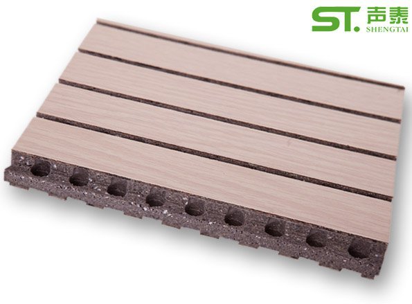 陶鋁裝飾吸音板采用多種不同的無機材料的組合,以無機材料為主要材料,通過添加導電瓷土粉、導電云母粉等導電材料、增強纖維等材料,采用無機黏合劑粘合,自然固化的方法而 成的特殊板 材,再在其表面復合多種不同的裝飾材料,從而形成不同的裝飾效果。實現吸聲的技術原理是:一是在材料本身內形成多孔結構,達到一定的吸聲效果,其二是在成 品板上通過開槽、鉆孔形成穿孔板共振結構,達到吸聲效果。并配合吸聲無紡布進一步提升吸音效果。